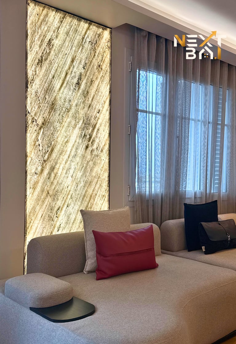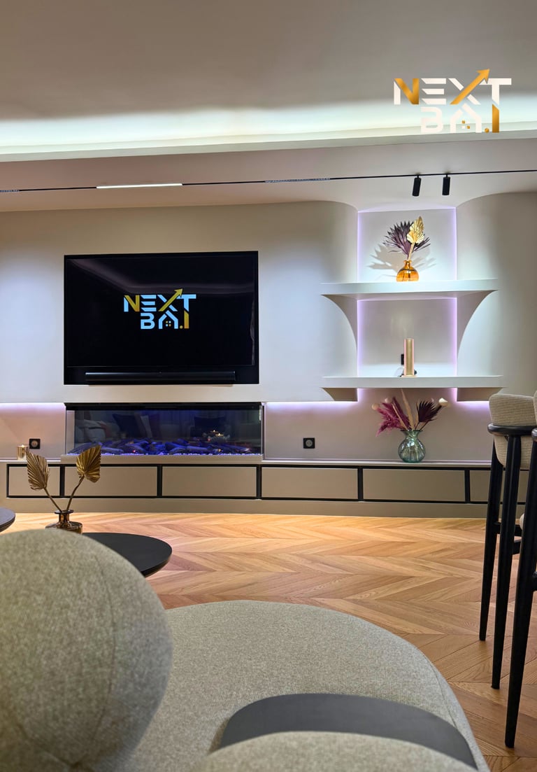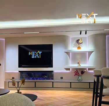 Réalisation haut de gamme au cœur du Paris 8 : un salon métamorphosé avec un mur architectural sur-mesure, intégrant écran XXL, cheminée moderne et feuille de marbre.