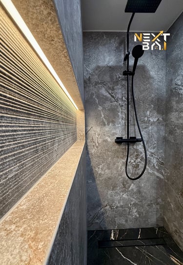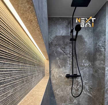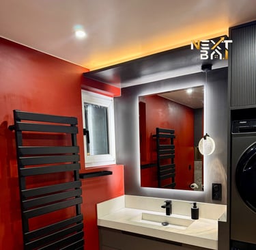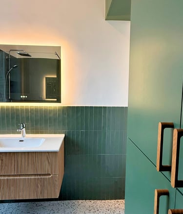 Pose d’un carrelage mural contemporain, d’un mobilier suspendu sur mesure et d’un éclairage intégré pour un rendu haut de gamme et fonctionnel.