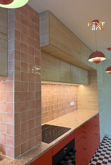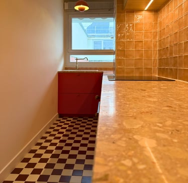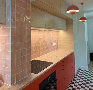 Pose d’un carrelage en petits carreaux marbre rose, mobilier rouge piment et détails vintage soigneusement sélectionnés.