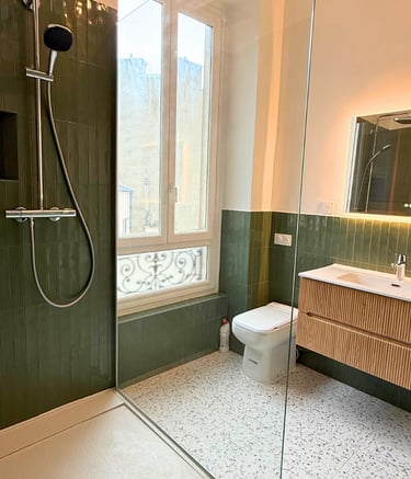 Transformation intégrale incluant la mise en peinture, le ponçage et la vitrification du parquet. Création d’une salle de bain dédiée à la chambre enfant et modernisation de l’installation électrique pour un confort optimal.