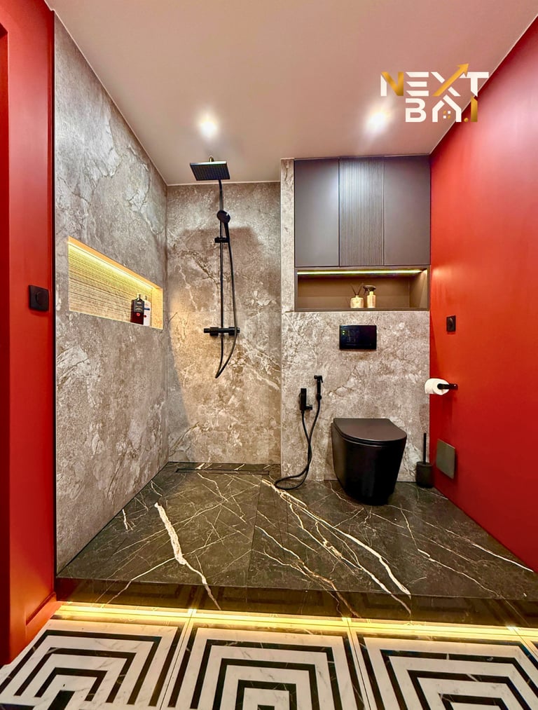 Marbre noir, carrelage noir et blanc et touches de bordeaux pour une ambiance raffinée.