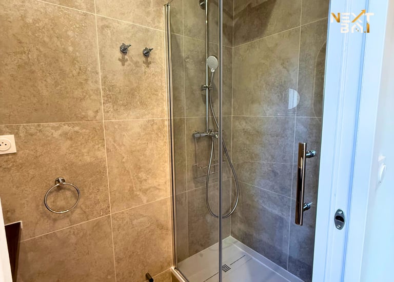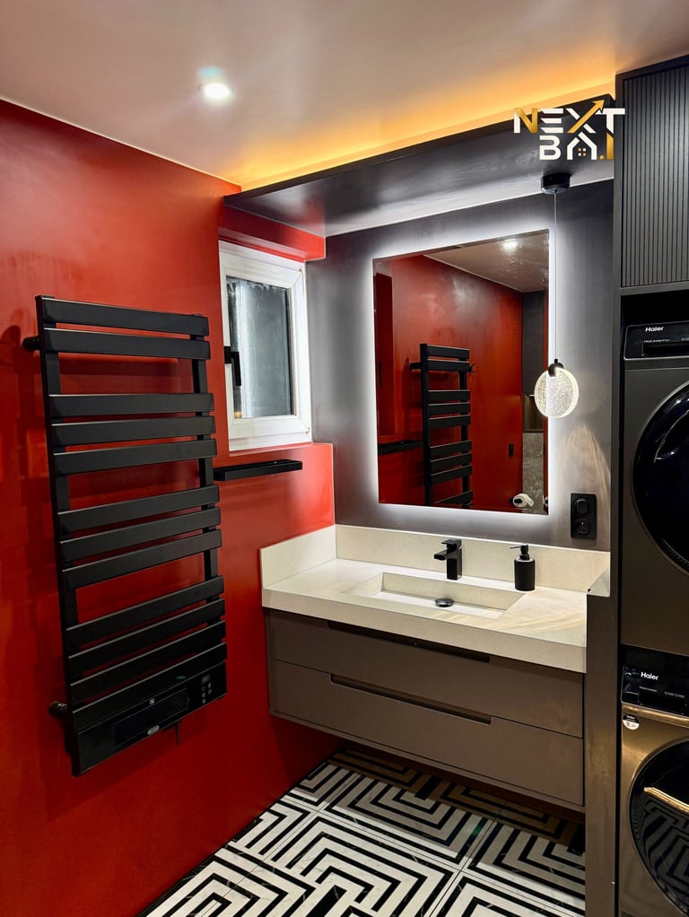 Rénovation intégrale de la salle de bain avec installation d’une porte coulissante moderne. Reprise complète des peintures de l’appartement et aménagement d’un espace fonctionnel dédié à la machine à laver et au sèche-linge.